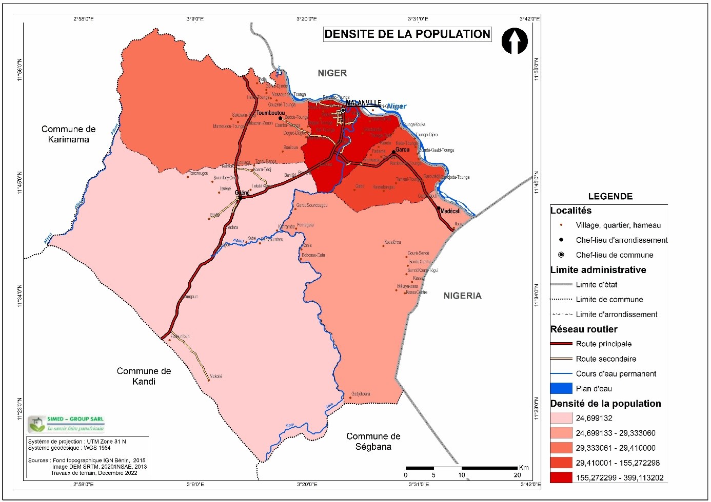 La figure 2 présente la répartition spatiale de la densité de population dans la commune de Malanville.